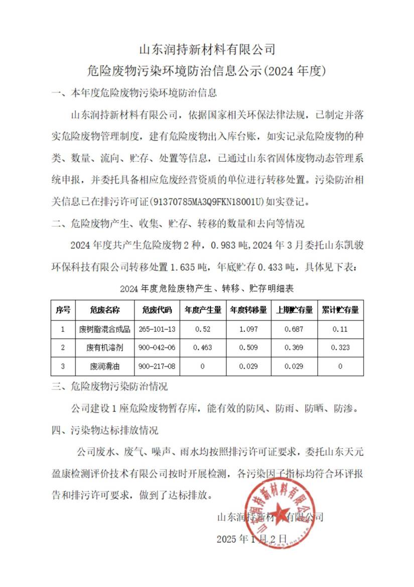 山東潤(rùn)持新材料有限公司 危險(xiǎn)廢物污染環(huán)境防治信息公示(2024年度)
